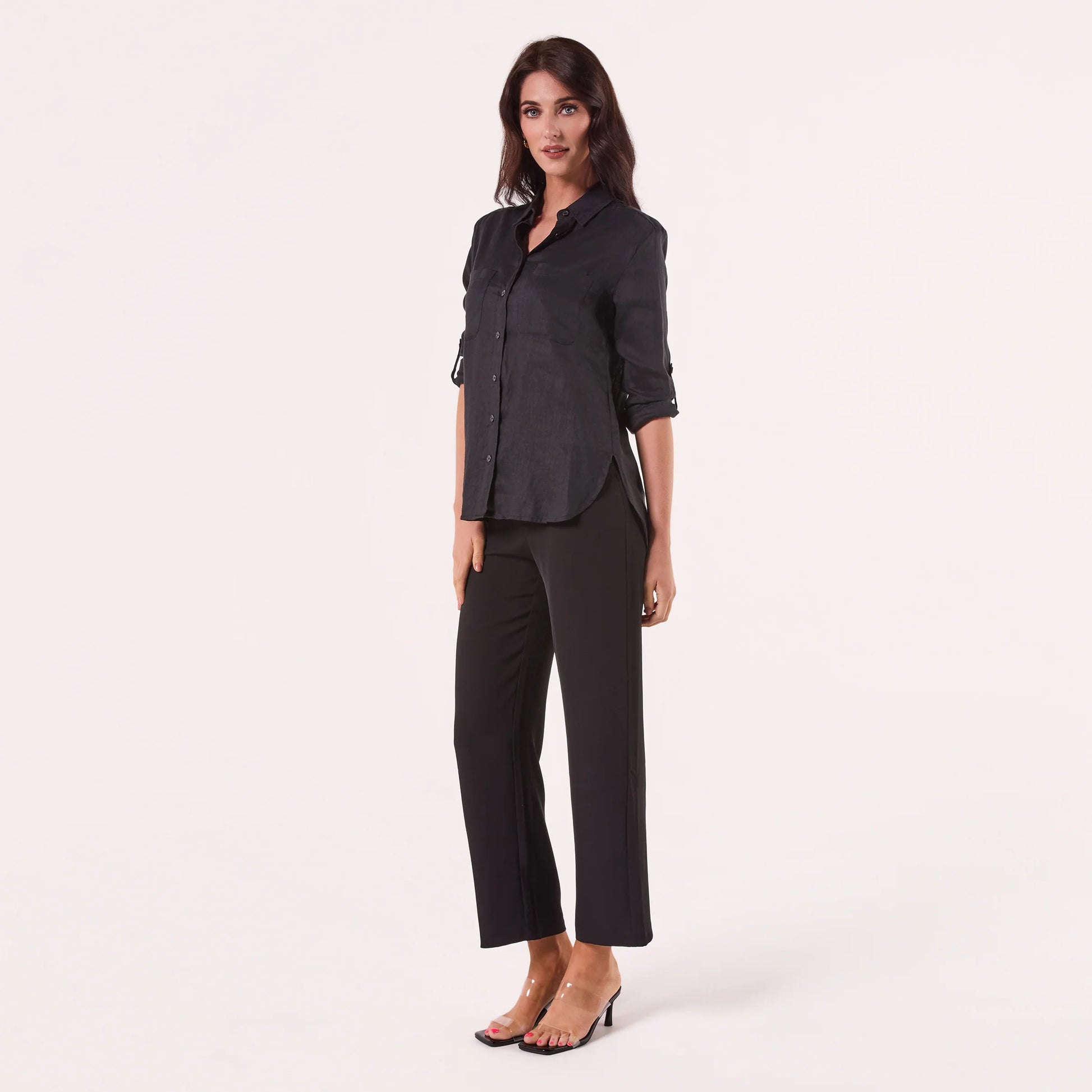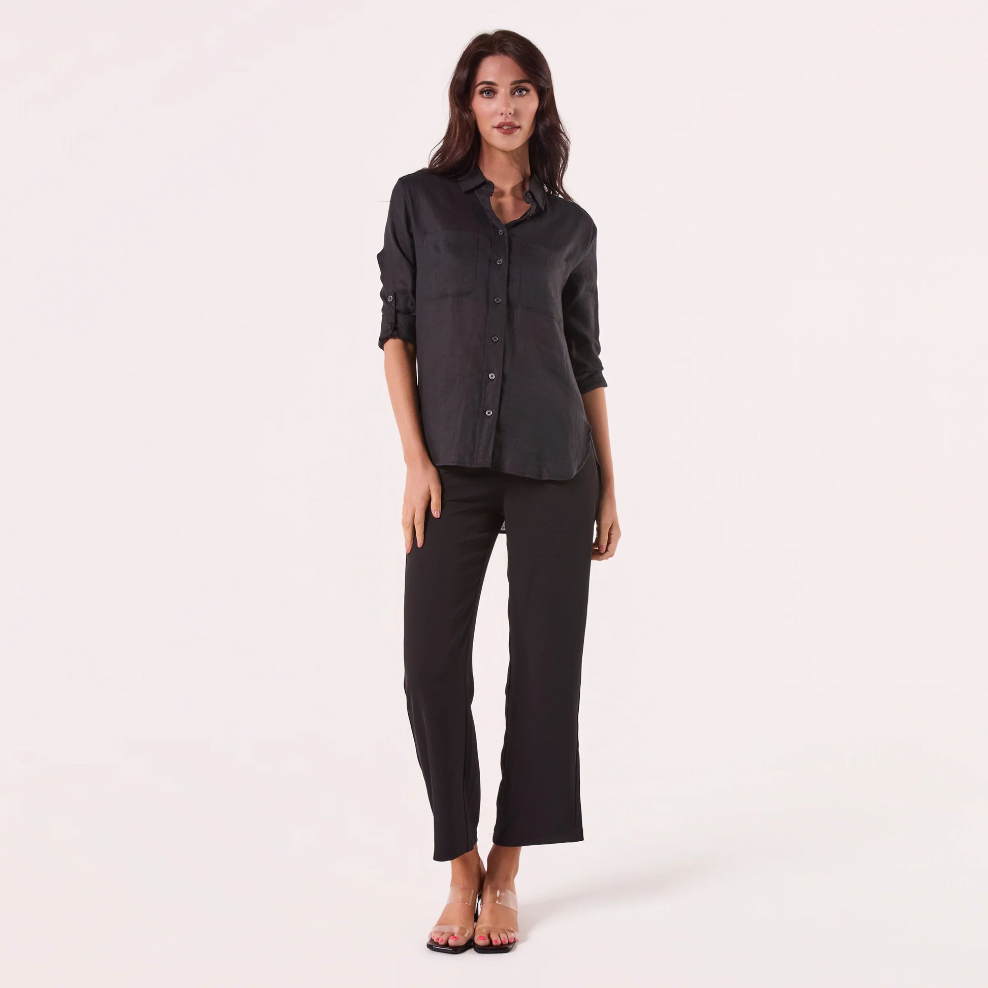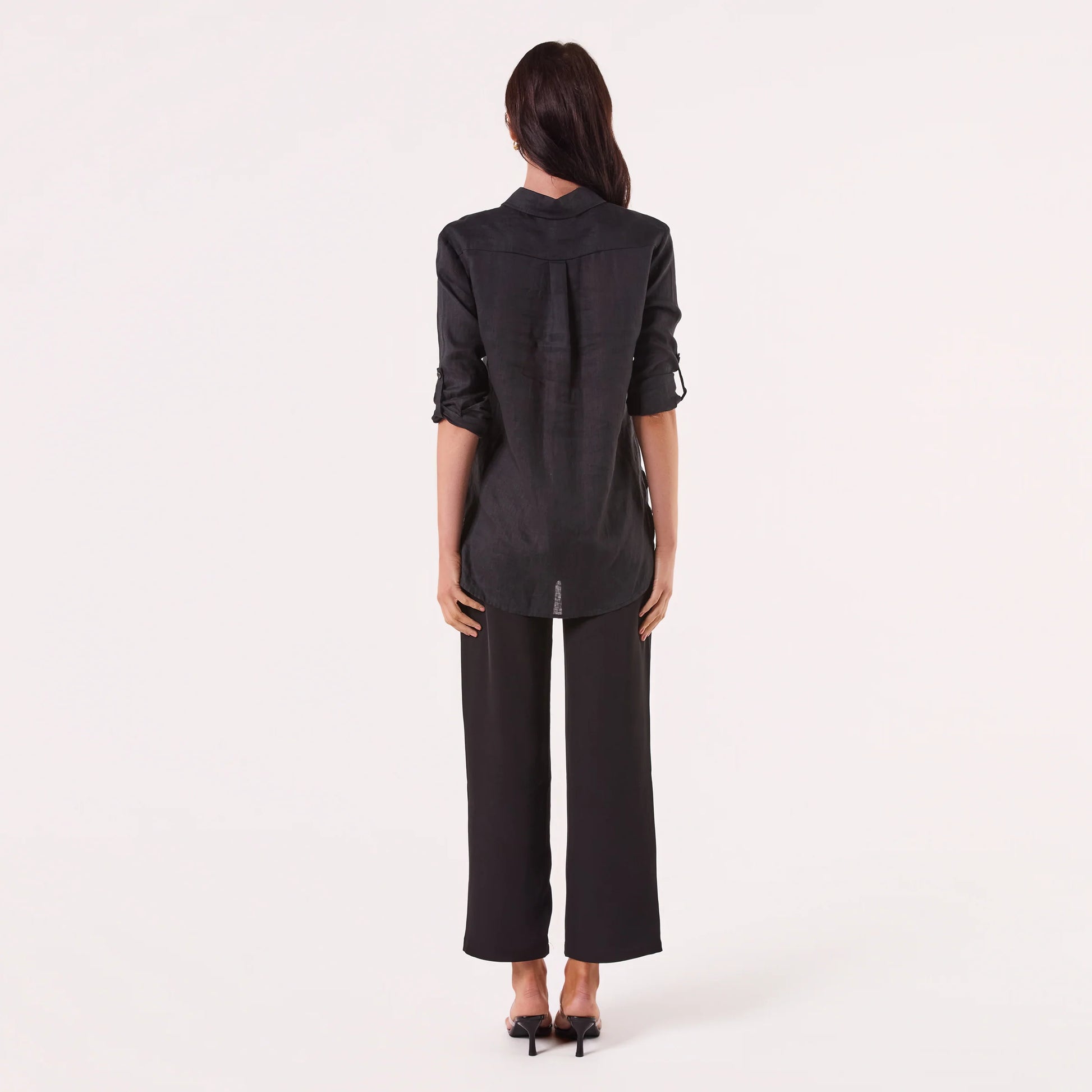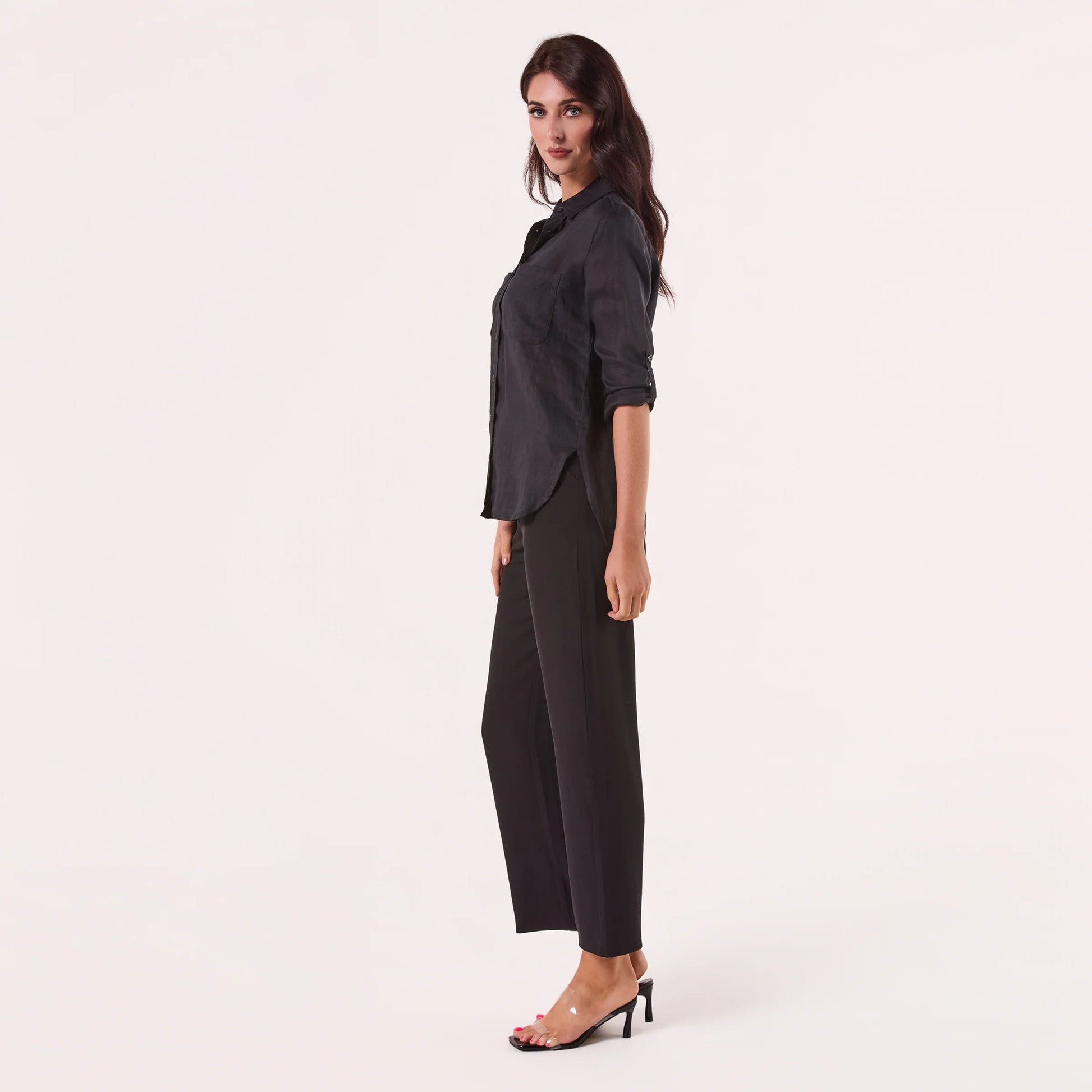 Elevate your wardrobe with VILMA, the perfect blend of style and comfort. Crafted from 100% high-quality linen, this linen shirt features a modern button-down design with a high-low hem and an elbow button for easy sleeve roll-up full length sleeve. Its versatility makes it perfect for layering.