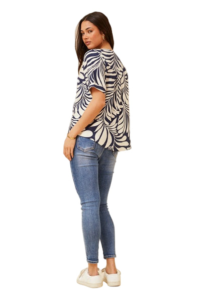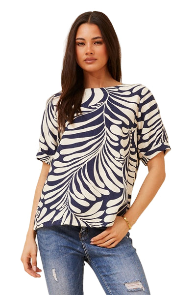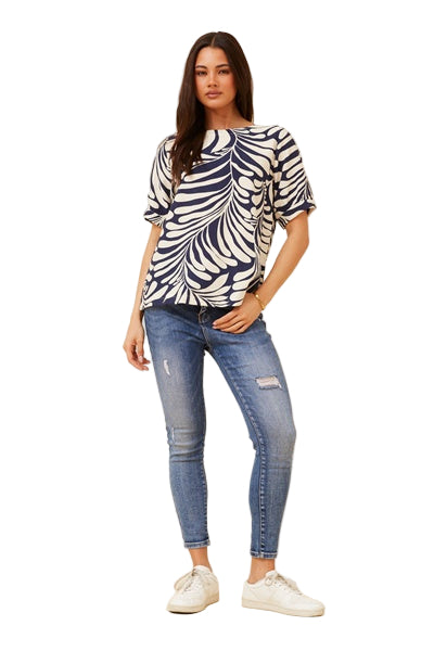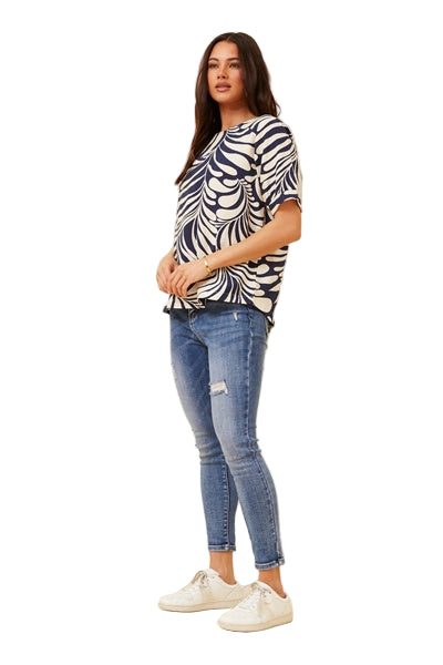 The ASHLEY TOP delivers effortless sophistication with its abstract print and silk-feel fabric. Designed with a round neckline, short sleeves, and curved hem, this regular-fit piece transitions seamlessly from casual to refined. The unlined construction ensures breathability, making it ideal for layering or wearing solo. Pair with your favourite jeans and sandals for an understated, polished everyday aesthetic.