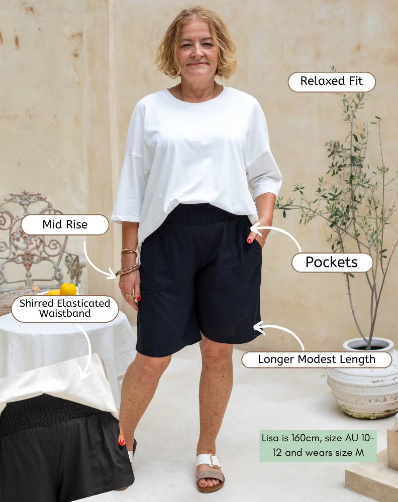 Embrace laid-back comfort with the Brunswick Shorts in Black. Crafted from breathable rayon, these knee-length shorts feature a thick elastic panel waistband with shirring for a secure, flattering fit. Generous side pockets keep your essentials close, while the lightweight fabric keeps you cool through warm weather. Throw them on with a simple tee or blouse for effortless summer style that works from casual outings to relaxed weekends.