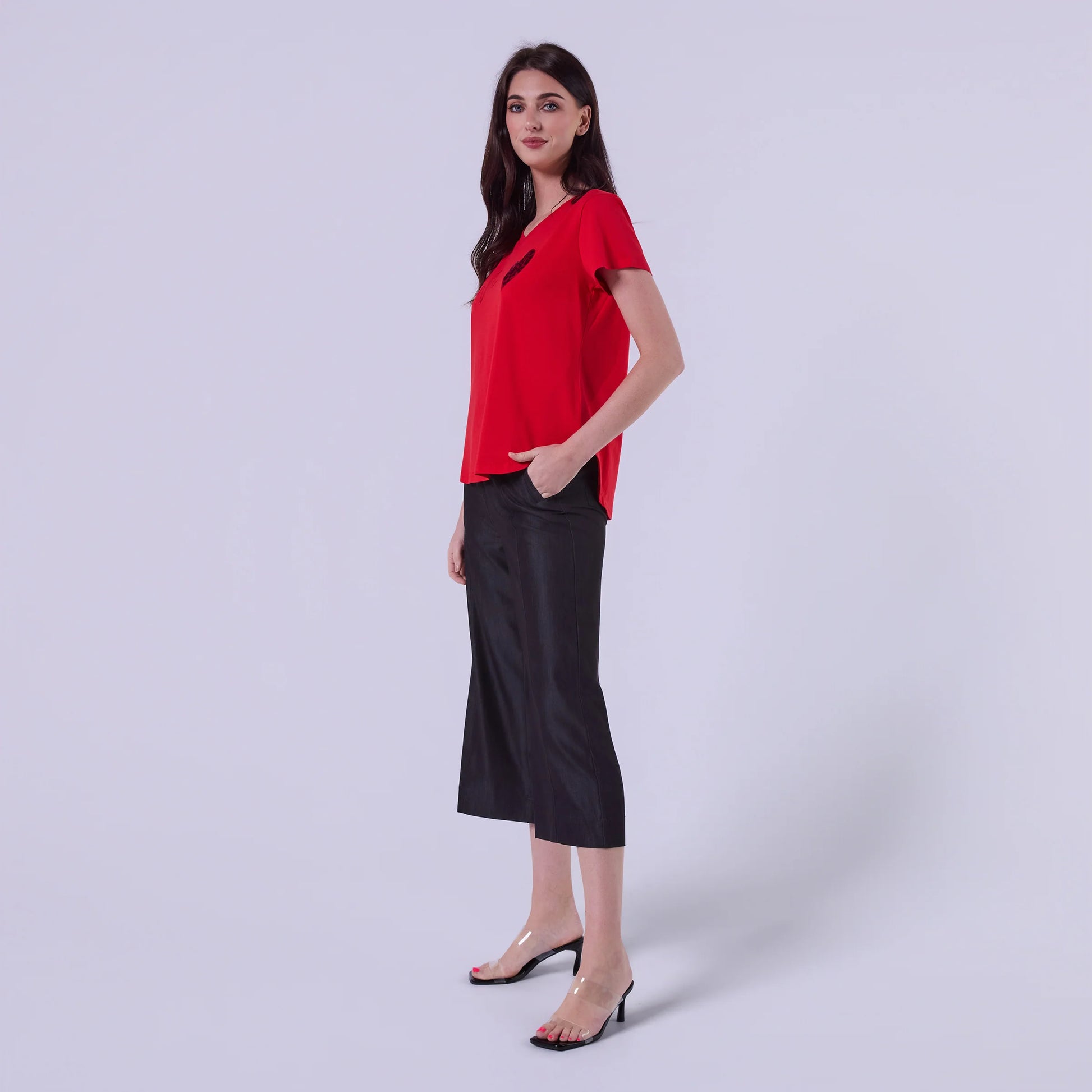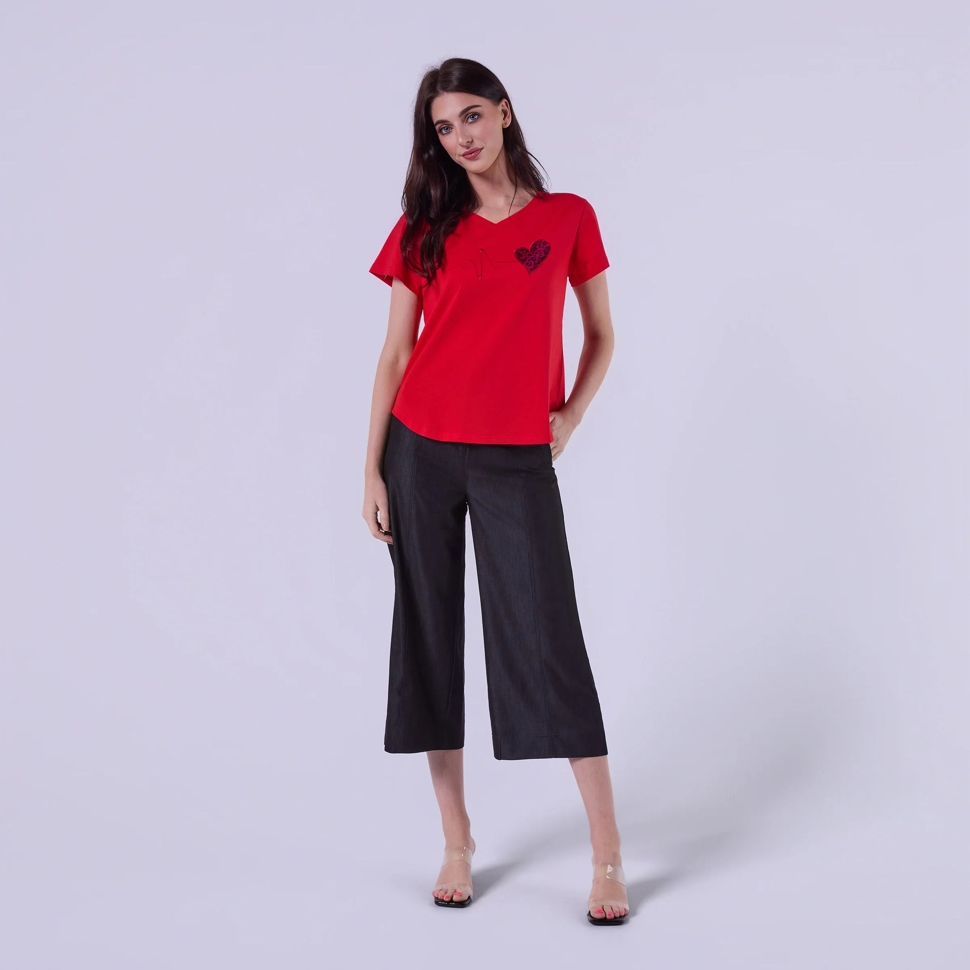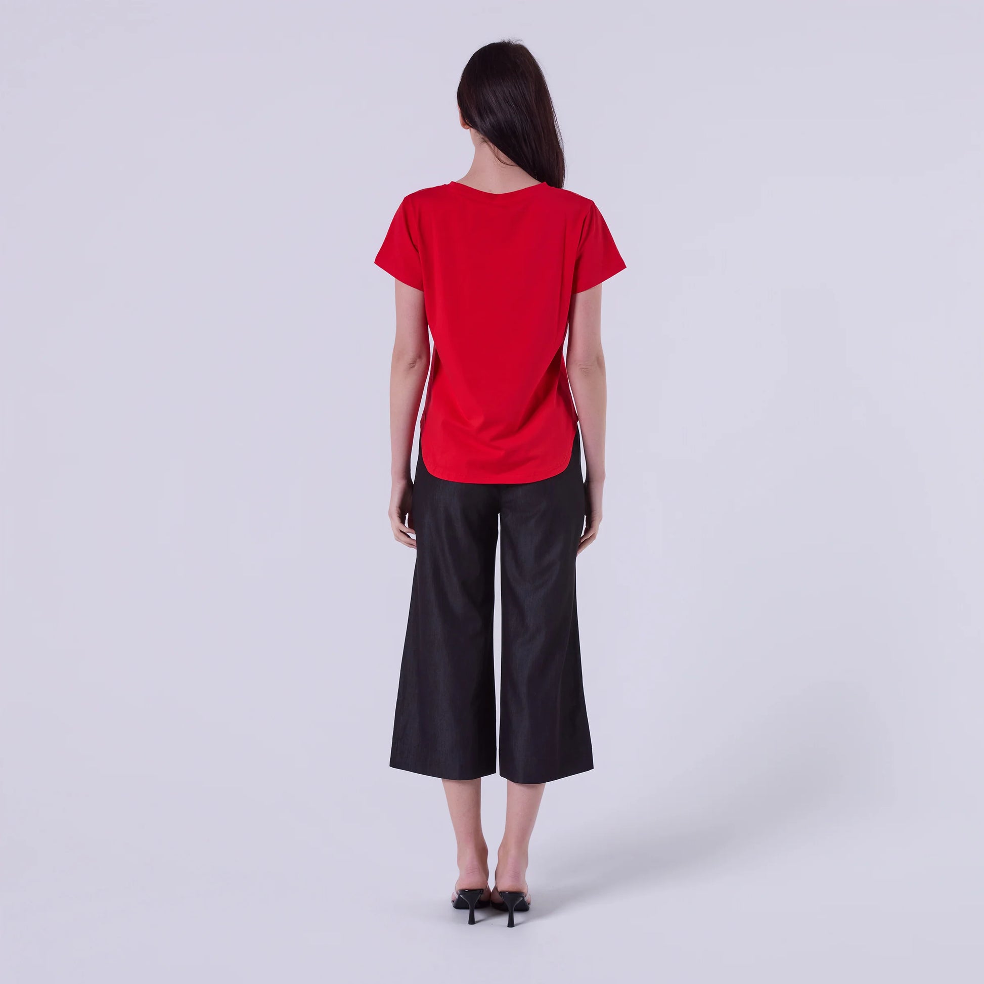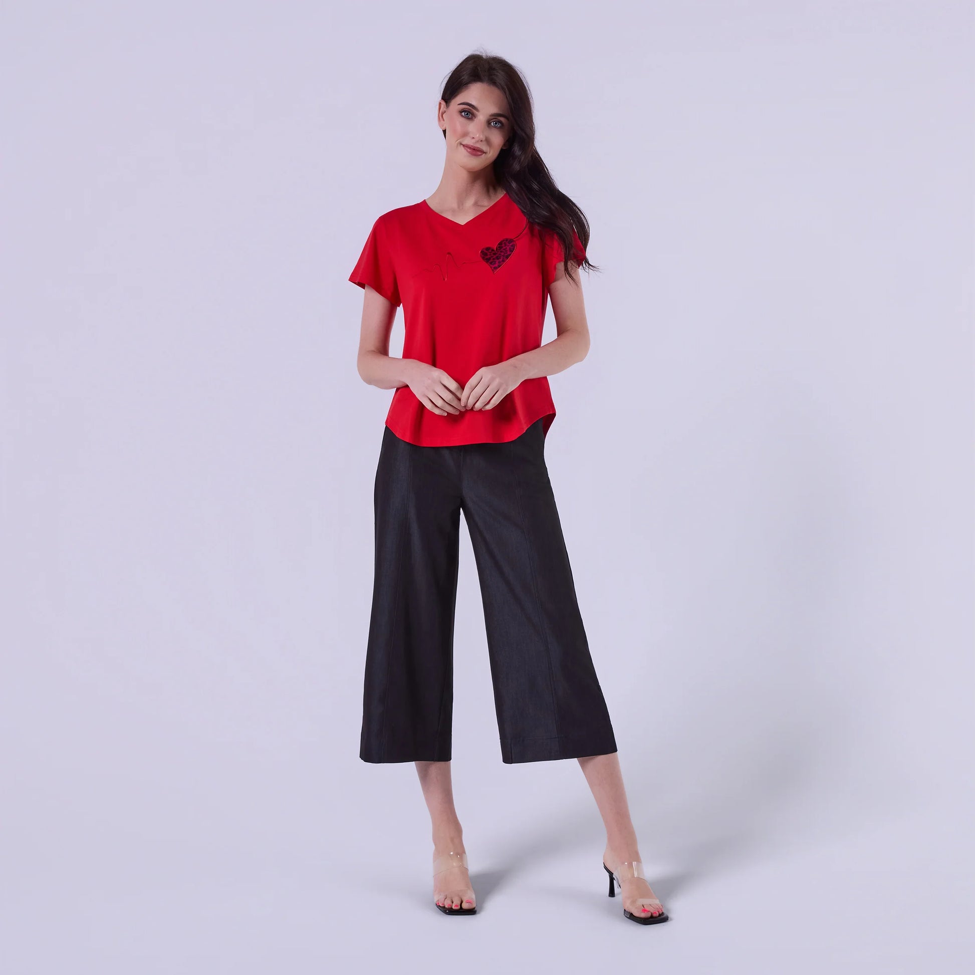 Meet your new everyday essential—the GIA in Red. This tee brings together comfort and style with a charming heartbeat design that speaks to the rhythm of your day. The flattering v-neck and generous fit let you move freely, while the curved hem adds a subtle, stylish flourish that elevates any casual look. Supportive, versatile, and effortlessly cool, it's the perfect piece for layering or wearing solo when you want to dial up the calm sophistication.