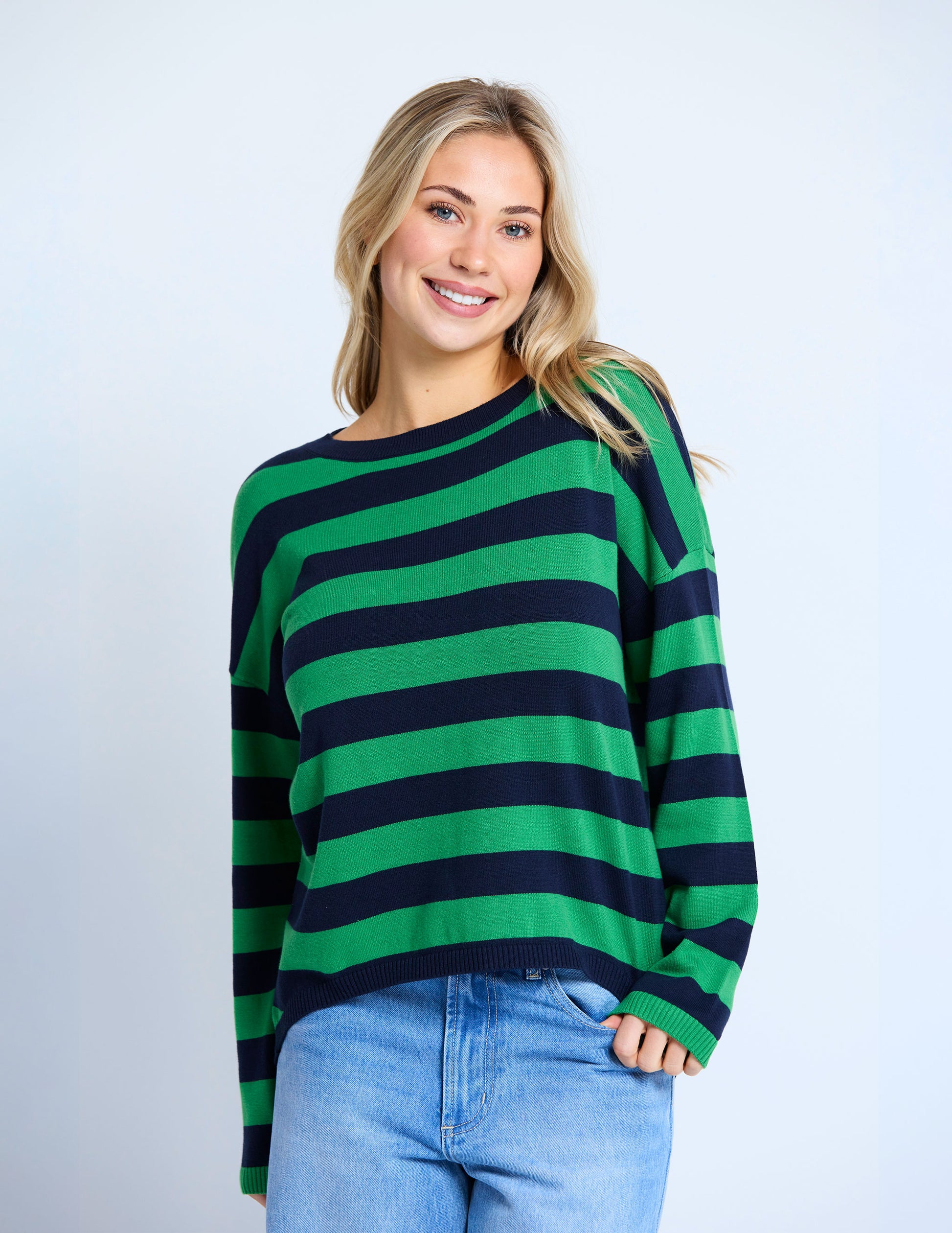 This playful Highland Stripe Sweater features a lightweight jersey knit with bold stripes and contrasting trims for a fun twist. Crafted from 100% cotton, it offers breathable comfort with a relaxed crew neck, dropped shoulders, and a trendy hi-lo hemline that adds a flirty flair to your casual look. Perfect for layering or wearing solo on breezy days!