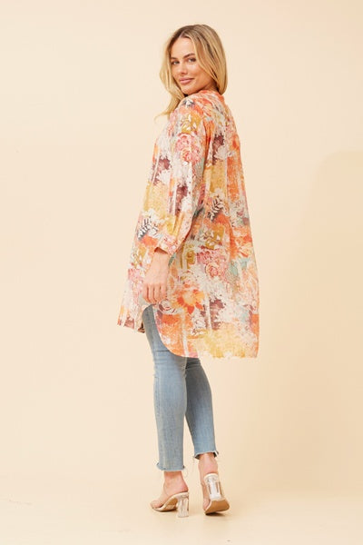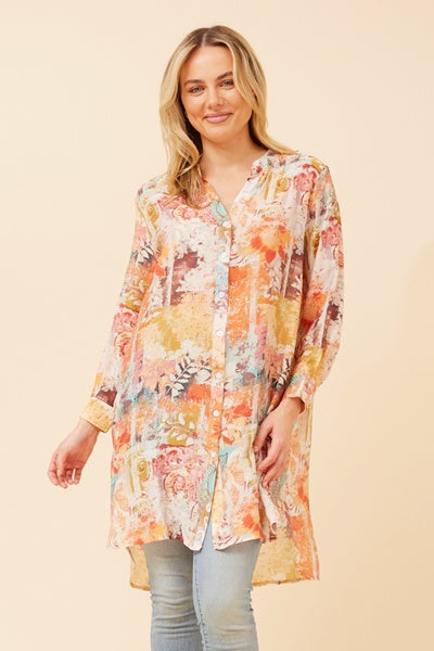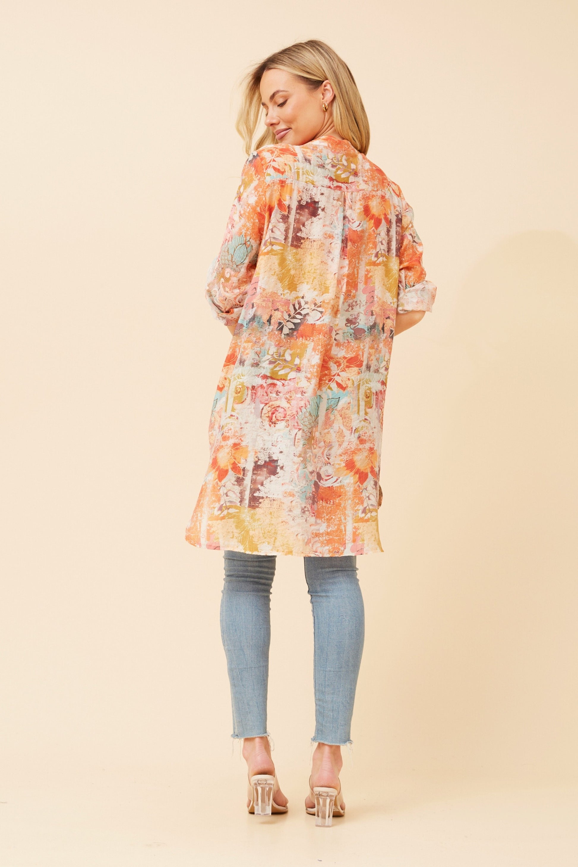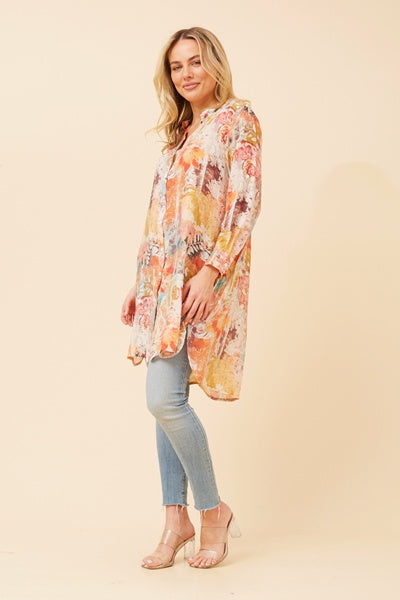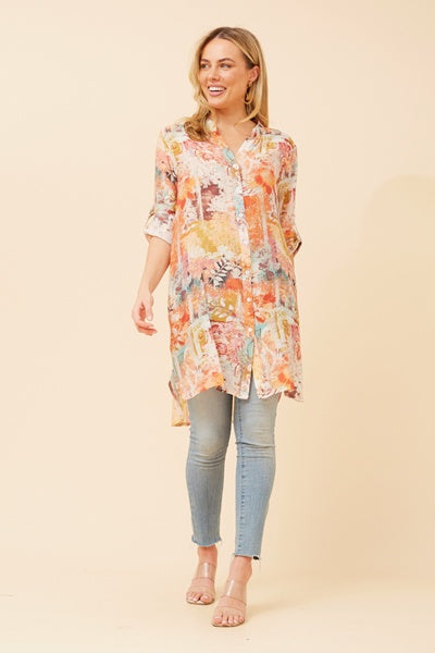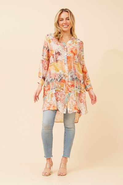 Elevate your wardrobe with the Jamie top, featuring a sleek mandarin collar and functional front buttons for effortless style. Its long roll-up sleeves add versatility, while the abstract print brings a modern edge. Crafted from silk-feel fabric, this regular fit top offers comfort without lining. The hi-low hem enhances movement and adds a chic silhouette that works from day to night. Perfect for those who appreciate subtle sophistication and easy elegance.
