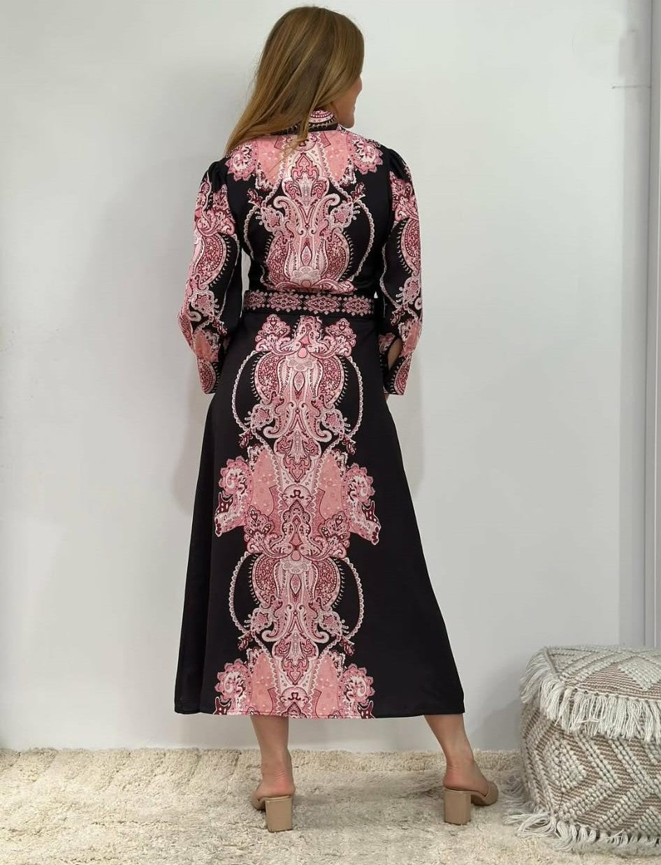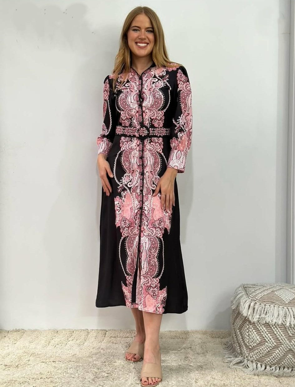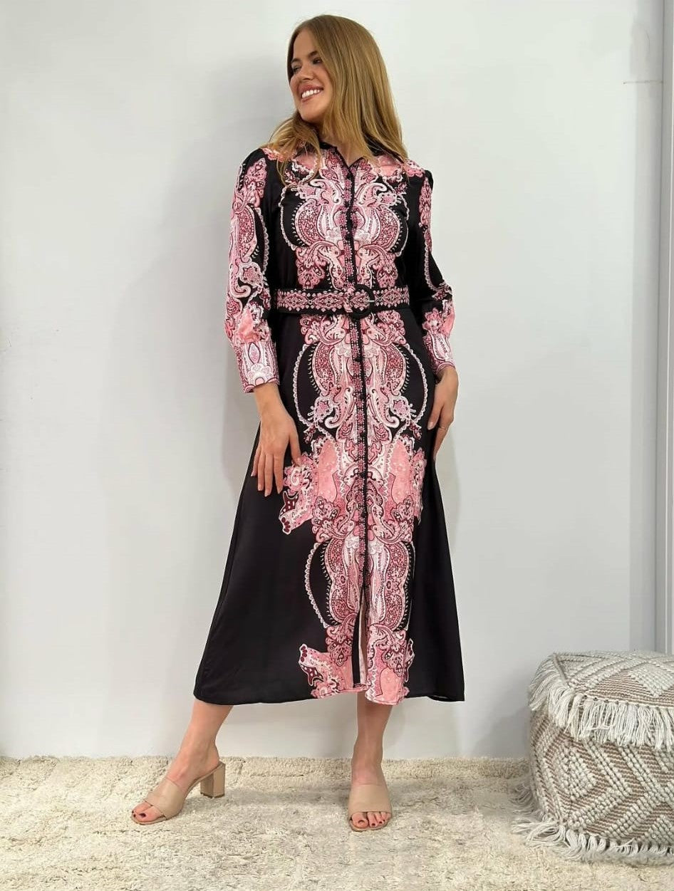 The JULIETA is a versatile midi shirt dress designed to flatter every figure. Featuring a charming pink embroidered print against a classic black base, this button-through style pairs effortlessly with heels for brunch or special occasions. The lightweight, non-stretch fabric offers all-day comfort, while the included belt lets you define your silhouette. Elegant, easy to wear, and undeniably gorgeous—the JULIETA works as hard as you do.
