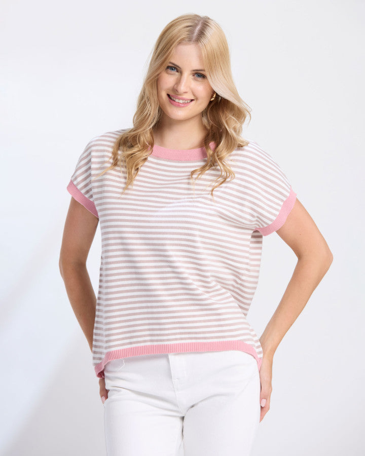 The Laneway Top features a lightweight striped knit crafted from 100% cotton, offering breathable comfort with a refined touch. Its crew neck and dropped cap sleeves create a relaxed yet elegant silhouette, while the contrast colour trims add subtle sophistication. The hi-lo hemline enhances its modern appeal, making it a versatile piece for polished, effortless style.