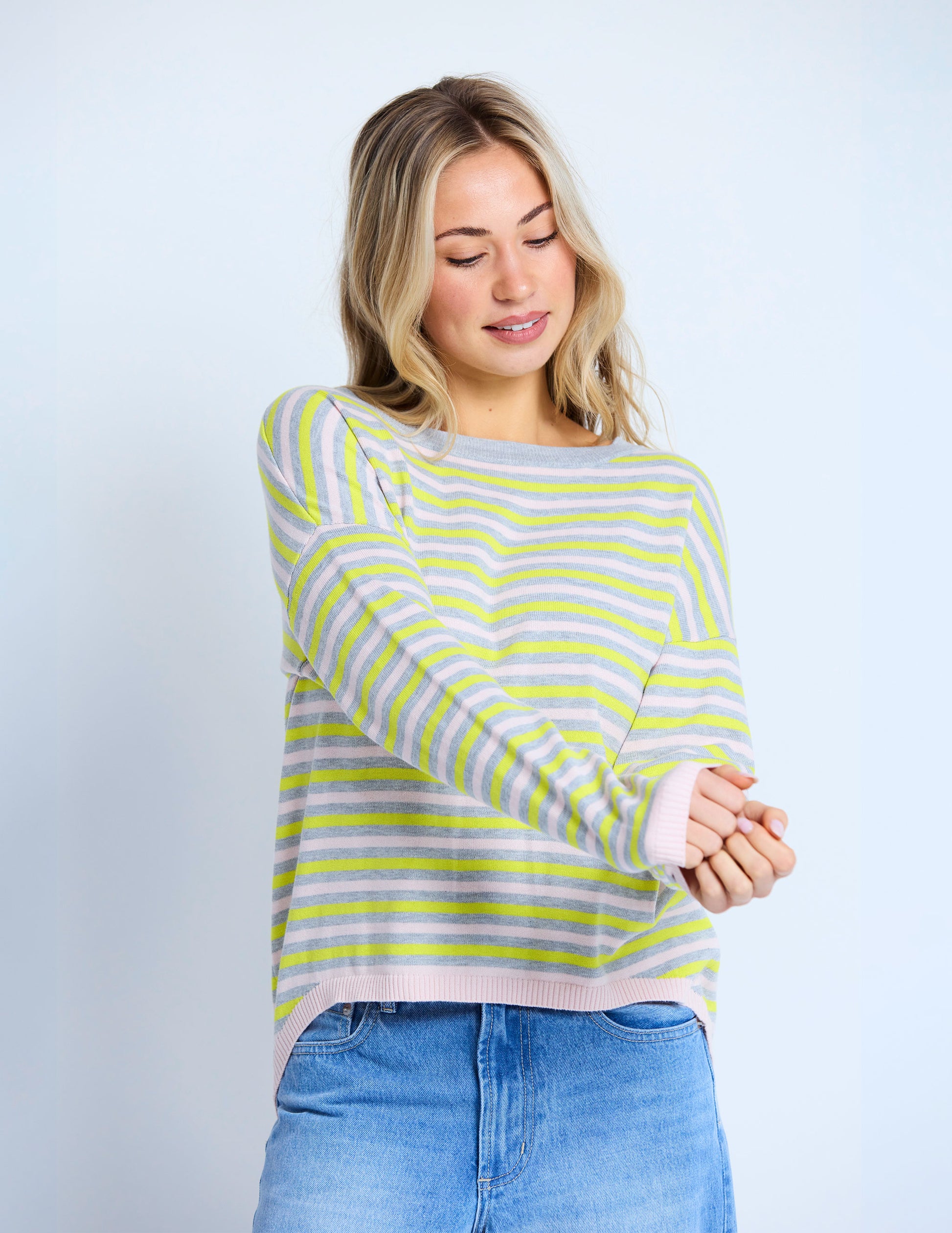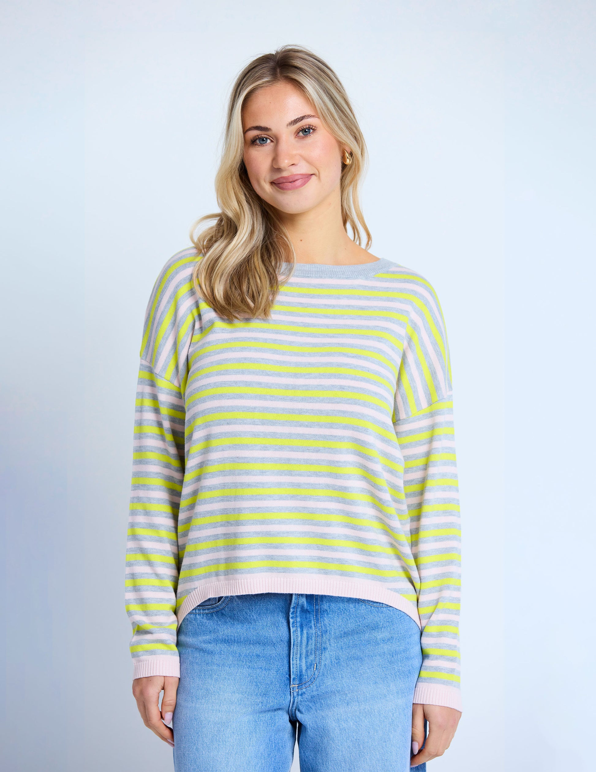 Crafted from 100% cotton, the Lemonberry Pop Sweater features a lightweight striped jersey knit with elegant contrast trims. Its refined crew neck dropped shoulder design, and subtly hi-lo hemline create a sophisticated silhouette perfect for effortless style and comfort.