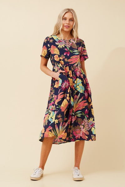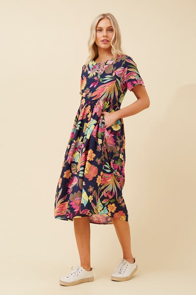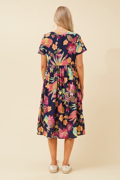 The LUCILLE dress features a flattering round neckline and comfortable short sleeves, perfect for everyday wear. Its midi length and regular fit provide an elegant silhouette, enhanced by delicate gathering on the skirt. Functional side pockets add practicality without sacrificing style. The floral botanical print brings a fresh, natural vibe, while the partial lining ensures comfort and modesty. Ideal for both casual outings and special occasions, this dress combines effortless charm with thoughtful details.