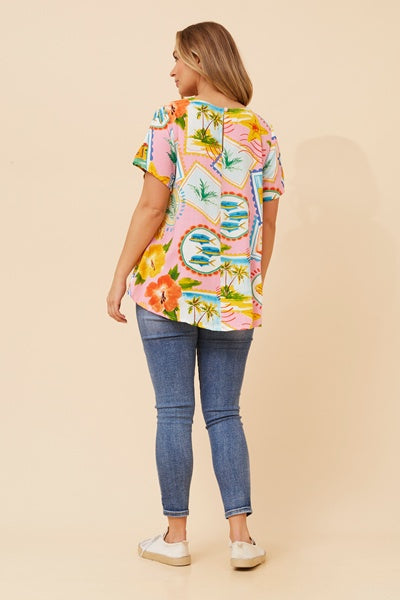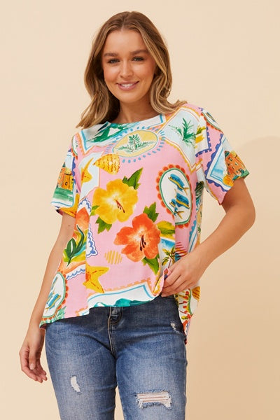 Embrace effortless style with the Marina Top—a relaxed essential designed for weekend adventures and getaways. This charming piece features a patchwork postcard print, rounded neckline, and playful back keyhole detail with button closure. The hi-low trapeze silhouette with curved hem flatters while keeping you comfortable. Pair with your favourite jeans and sneakers for casual ease, or dress it up with linen pants and sandals. Made in India with a regular fit and short sleeves, it's the versatile layer you'll reach for again and again.