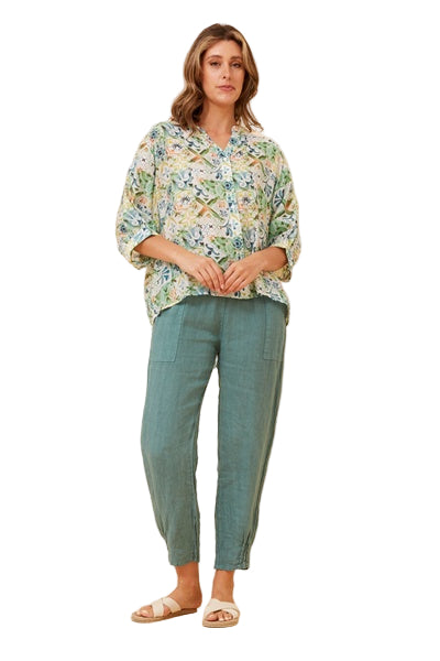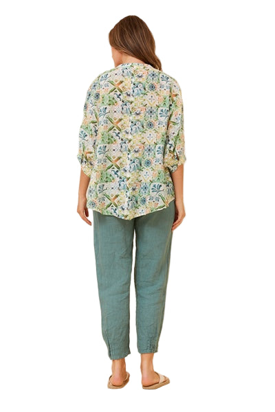 Elevate your everyday style with the ROXY TOP, featuring a chic open V neckline and mandarin collar for a fashionable edge. The 3/4 puff sleeves with button closures add a delicate touch, while the functional front buttons and back button detail offer practicality and charm. Crafted from silk-feel fabric, this top boasts an abstract print and a curved high-low hem that flatters every figure. With a generous, unlined fit, the ROXY TOP pairs effortlessly with jeans and sneakers or linen pants and sandals for a versatile look you’ll love wearing.