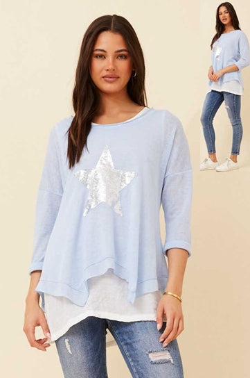 Elevate your everyday style with the SKY DOUBLE LAYER TOP, featuring a playful star print and sparkling sequin details. Its double-layered design and hanky hem add a fun twist, while the back button slit keeps things breezy. With a round neckline, 3/4 sleeves, and a generous fit, this top pairs perfectly with jeans and sneakers for a cool, casual vibe. Partially lined for comfort, it’s your new go-to for effortless daytime charm.