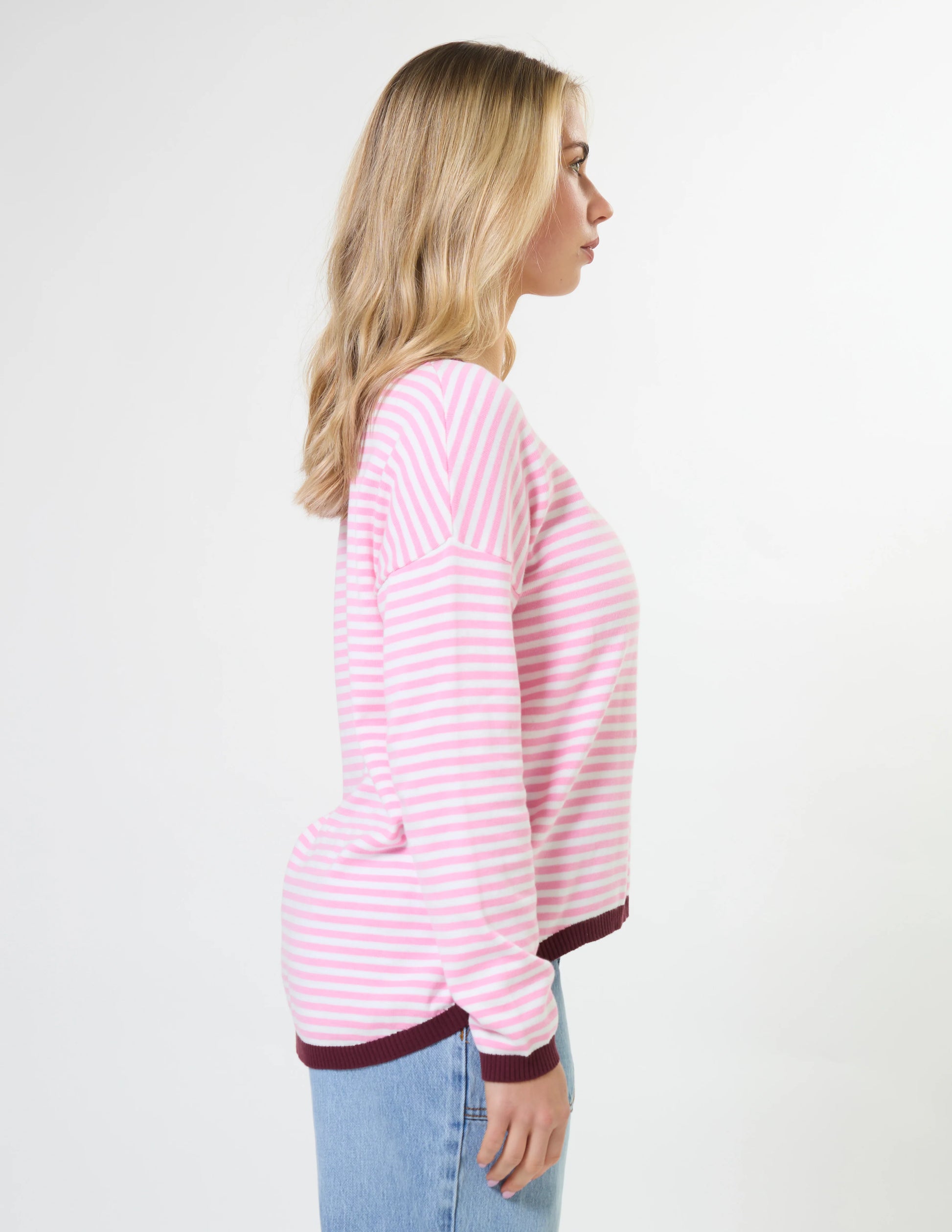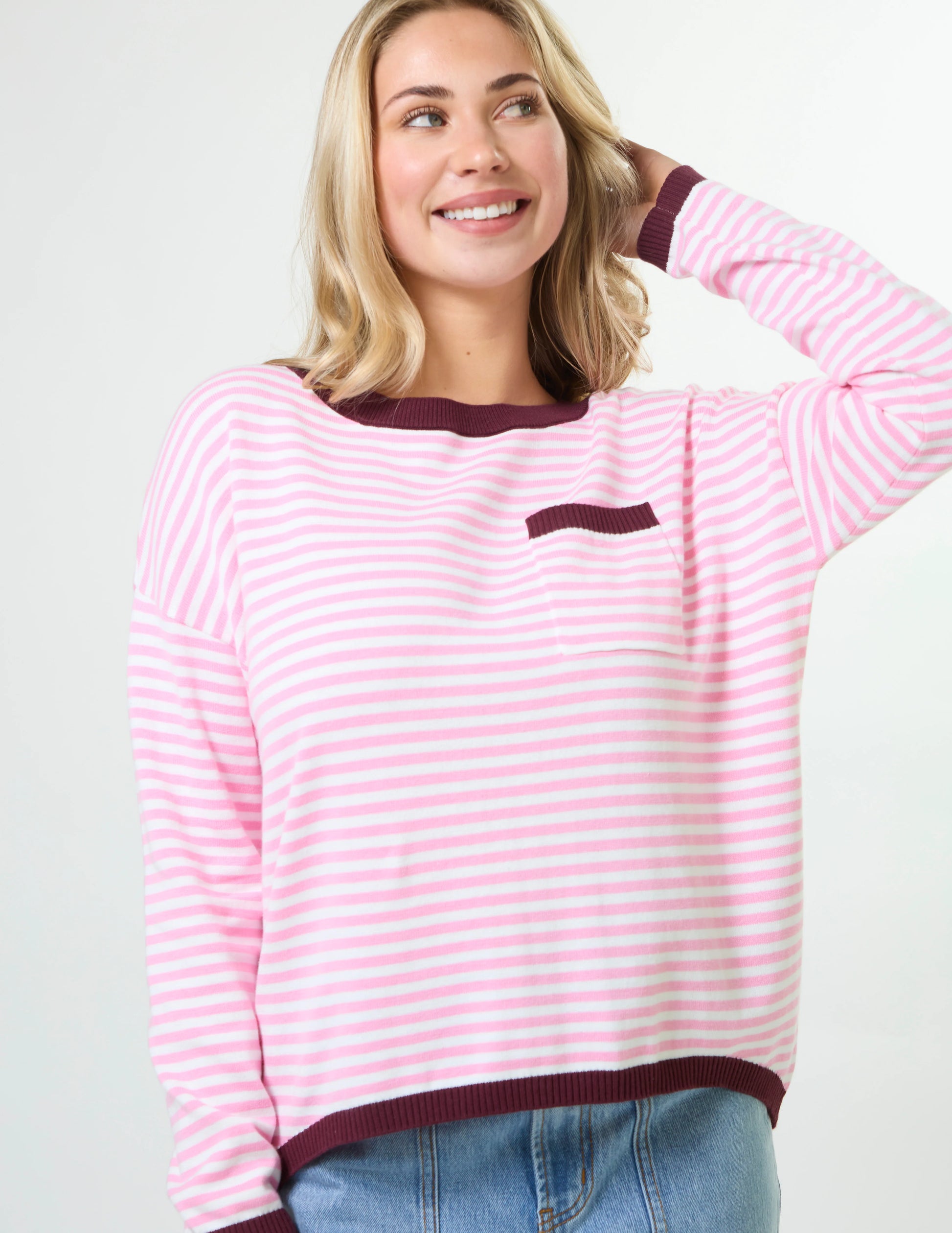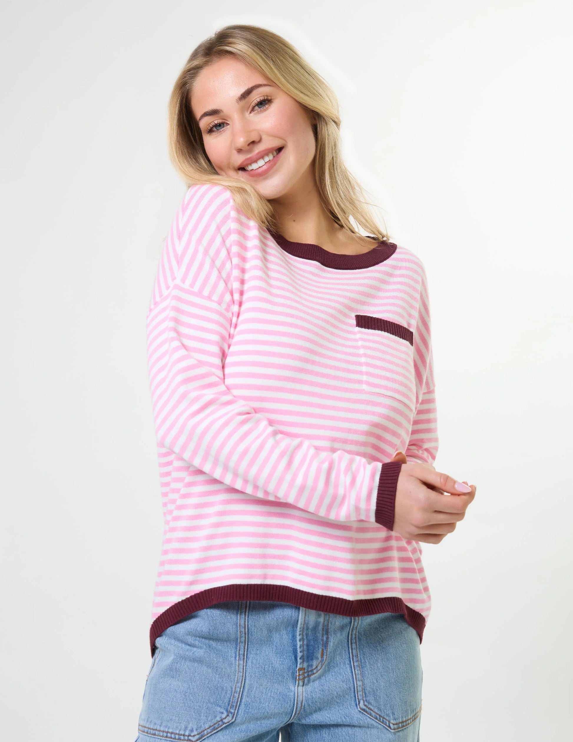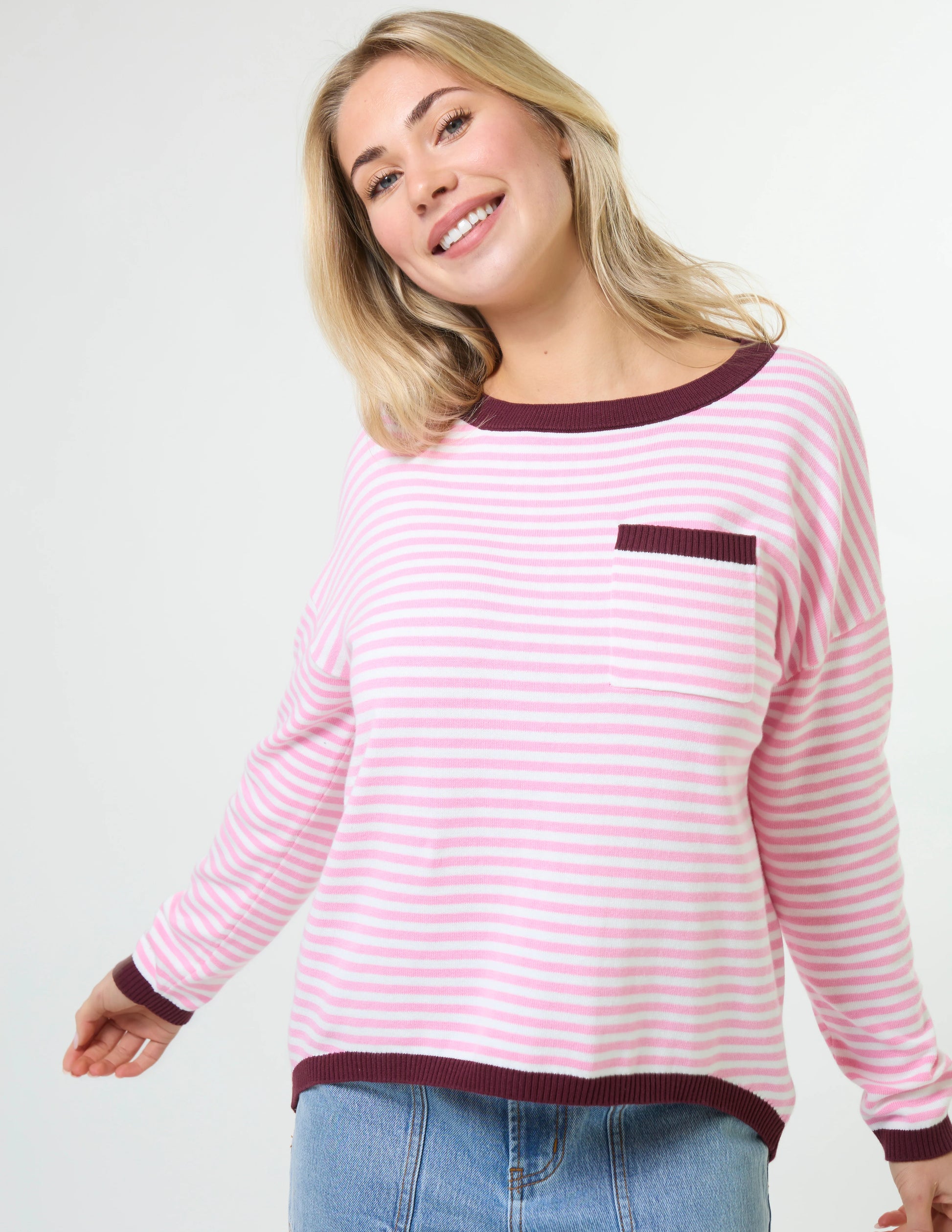 Effortless style meets everyday comfort in this versatile street pocket jumper. Crafted from 100% cotton jersey knit, the lightweight fabric moves with you while the classic crew neck and practical chest pocket keep things functional. Striking contrast colour trims frame the neckline and cuffs, while the dropped shoulder silhouette delivers that relaxed, contemporary fit. The subtle hi-lo hemline adds modern edge to a wardrobe essential that transitions seamlessly from casual outings to laid-back weekends. Perfect for layering or wearing solo, this striped knit is the go-to piece you'll reach for again and again.