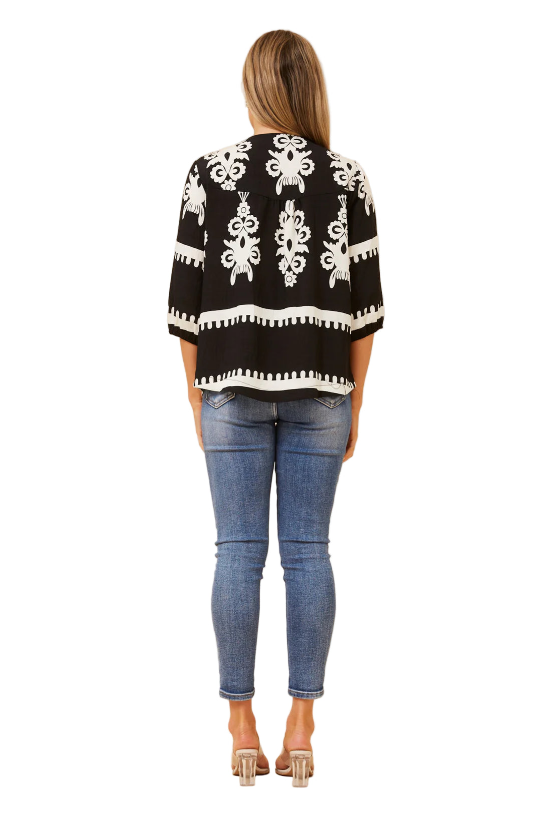 Effortless style meets everyday comfort in the Tatum Top. This versatile piece features a relaxed round neckline, three-quarter sleeves with elastic cuffs, and a distinctive border print that adds visual interest without demanding attention. The curved hem and regular fit create a flattering silhouette that works equally well with denim, shorts, or lightweight trousers. Partially lined for breathability, it's the go-to layer for days when you want to look polished without sacrificing comfort.