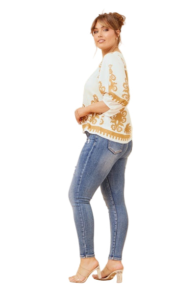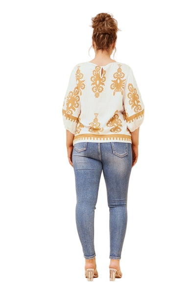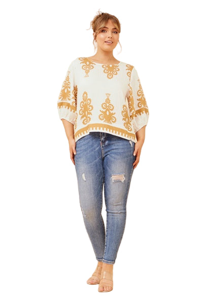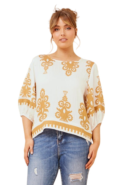 The Tatum Top combines effortless style with comfort, making it ideal for relaxed yet refined looks. Featuring a round neckline and 3/4 sleeves with elastic cuffs, it offers a flattering silhouette enhanced by a curved hem and elegant border print. Its regular fit and partial lining ensure ease of wear, whether paired with jeans, shorts, or linen pants for a polished, sophisticated ensemble.