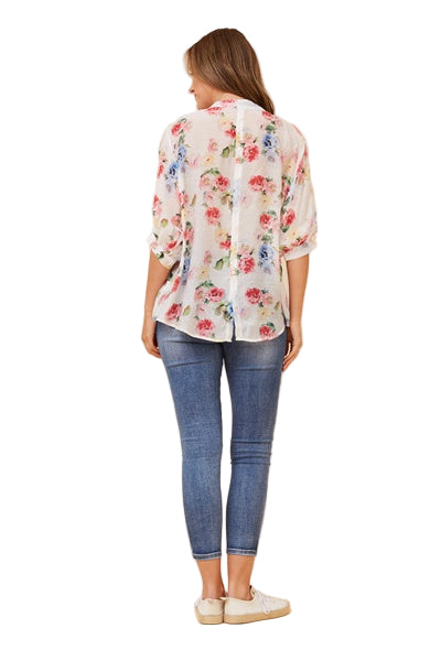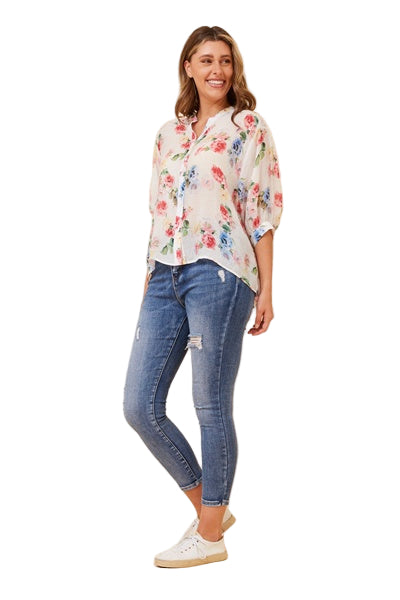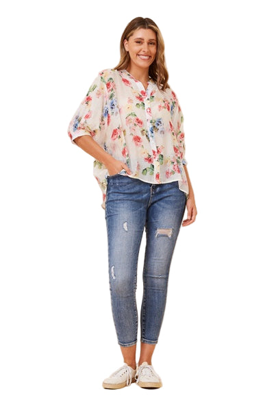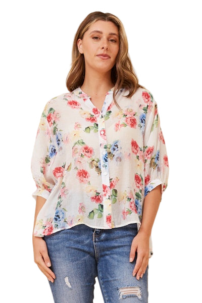 The TAYLOR blouse brings effortless elegance to your everyday wardrobe. Featuring a striking open V-neckline with mandarin collar and romantic 3/4 balloon sleeves finished with button details at the cuffs, this piece balances structure with fluidity. Functional front buttons and a back button detail add refined touches, while the delicate floral print brings visual interest. The slightly sheer fabric and generous fit create a relaxed silhouette, enhanced by a curved hi-low hem that moves beautifully. Unlined for breathable comfort.